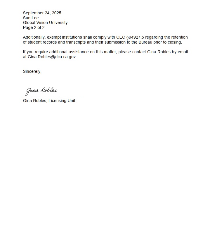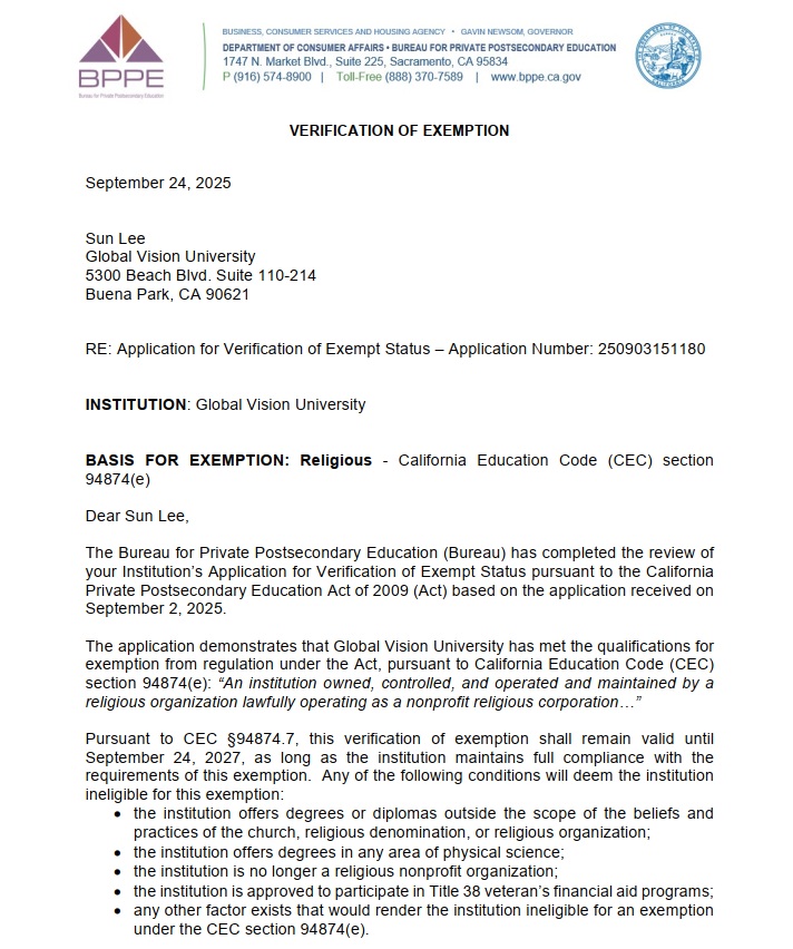 Global Vision University applies the verification of Exempt Status pursuant to the California Private Postsecondary Education Act of 2009(Act) by the Bureau for Private Postsecondary Education according to the California Education Code (CEC:§94874(e).